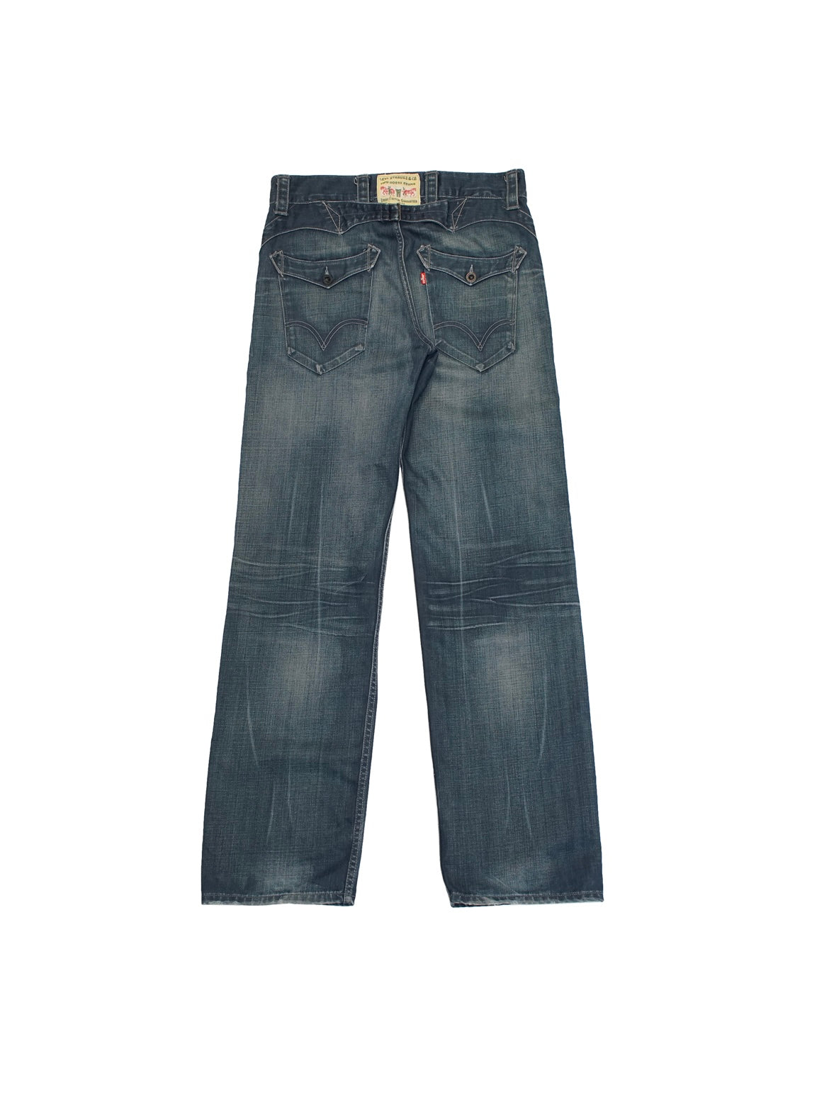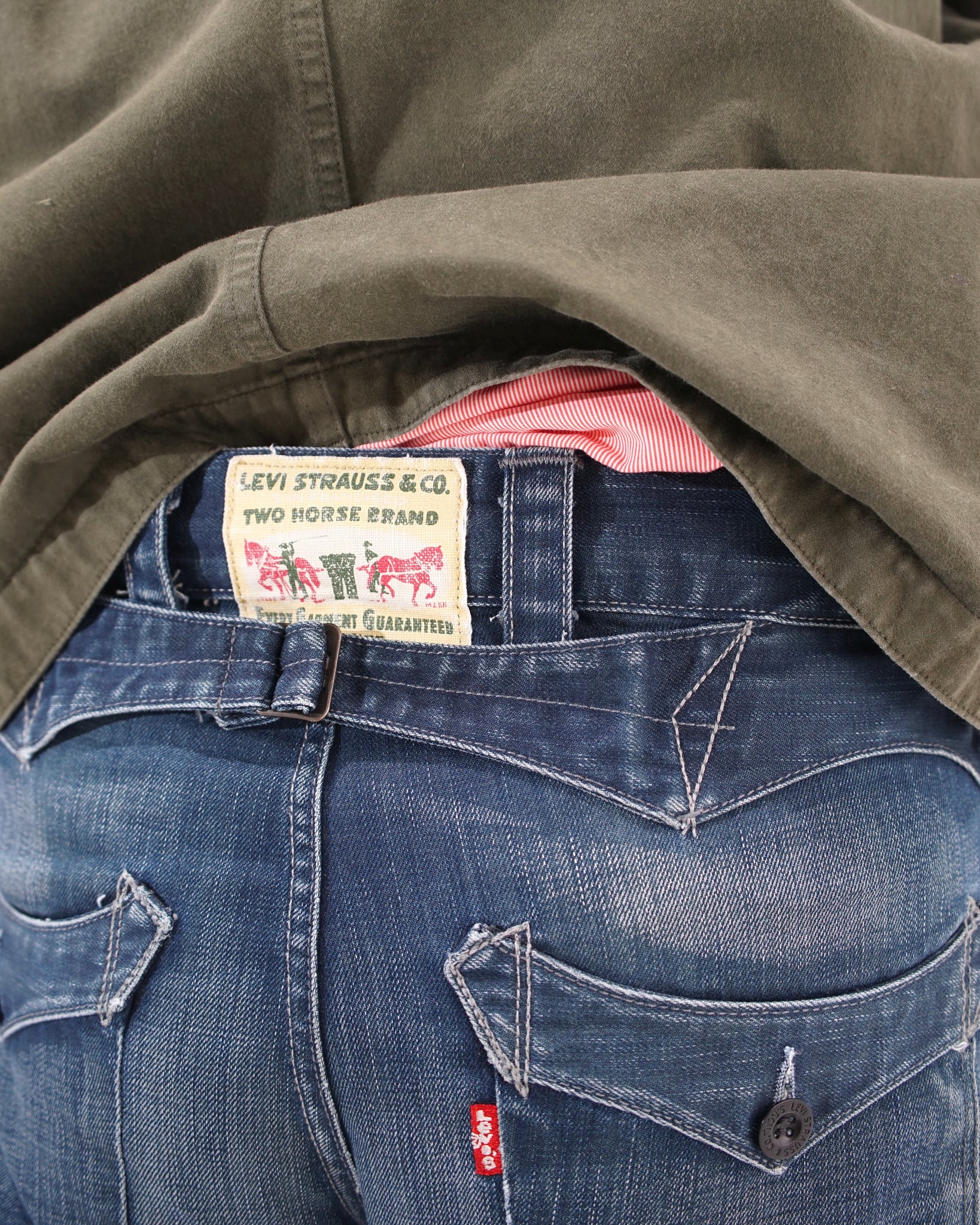 30年代の復刻をベースにしたシンチバック仕様に布パッチ、ルーズテーパードらしいゆったりとしたシルエット、さらにユーロリーバイスお得意のヴィンテージ加工、Levi's REDのカウボーイモデル的なポケットデザイン。