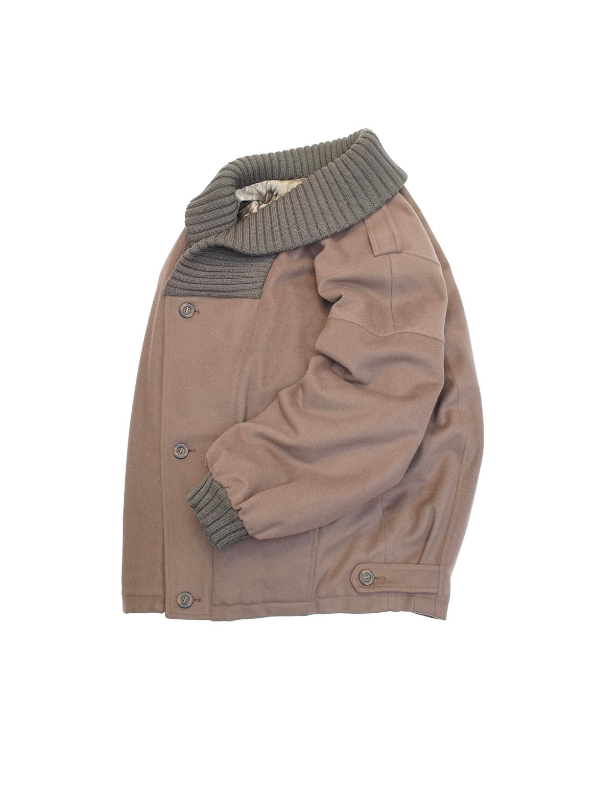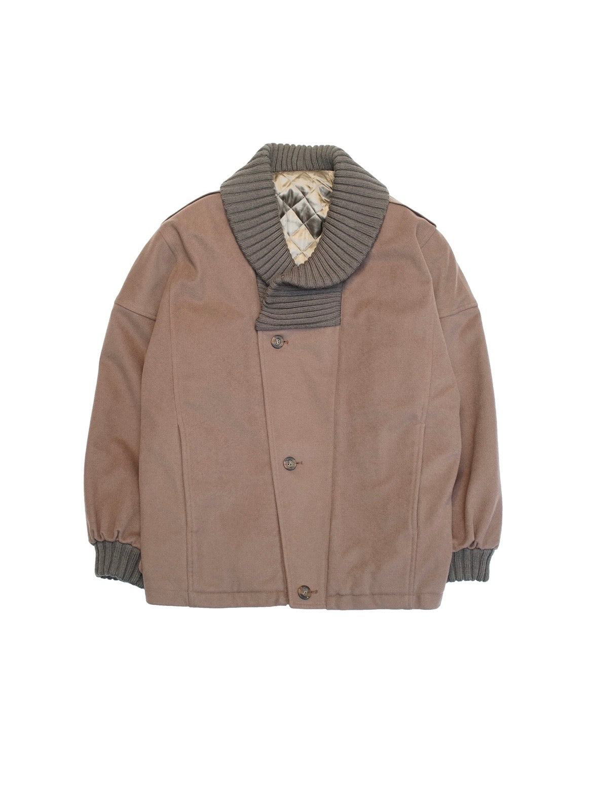 斜めにズレたフロント合わせ、ボリューミーなショールカラーにエポレット。袖までキルティングの裏地、異様なまでに広くとられた肩幅から滑らかに落ちるドロップショルダーのドルマンスリーブ、コンパクトなウエスト、ステッチ部分のスリットポケット。襟と同素材の袖リブ。