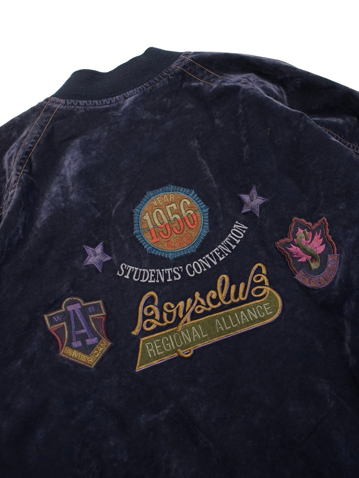 架空の50年代の学生連盟大会をモチーフにしたバック刺繍。配色やワッペンなどこのデザイナーならではの手の込んだデザインアプローチ。