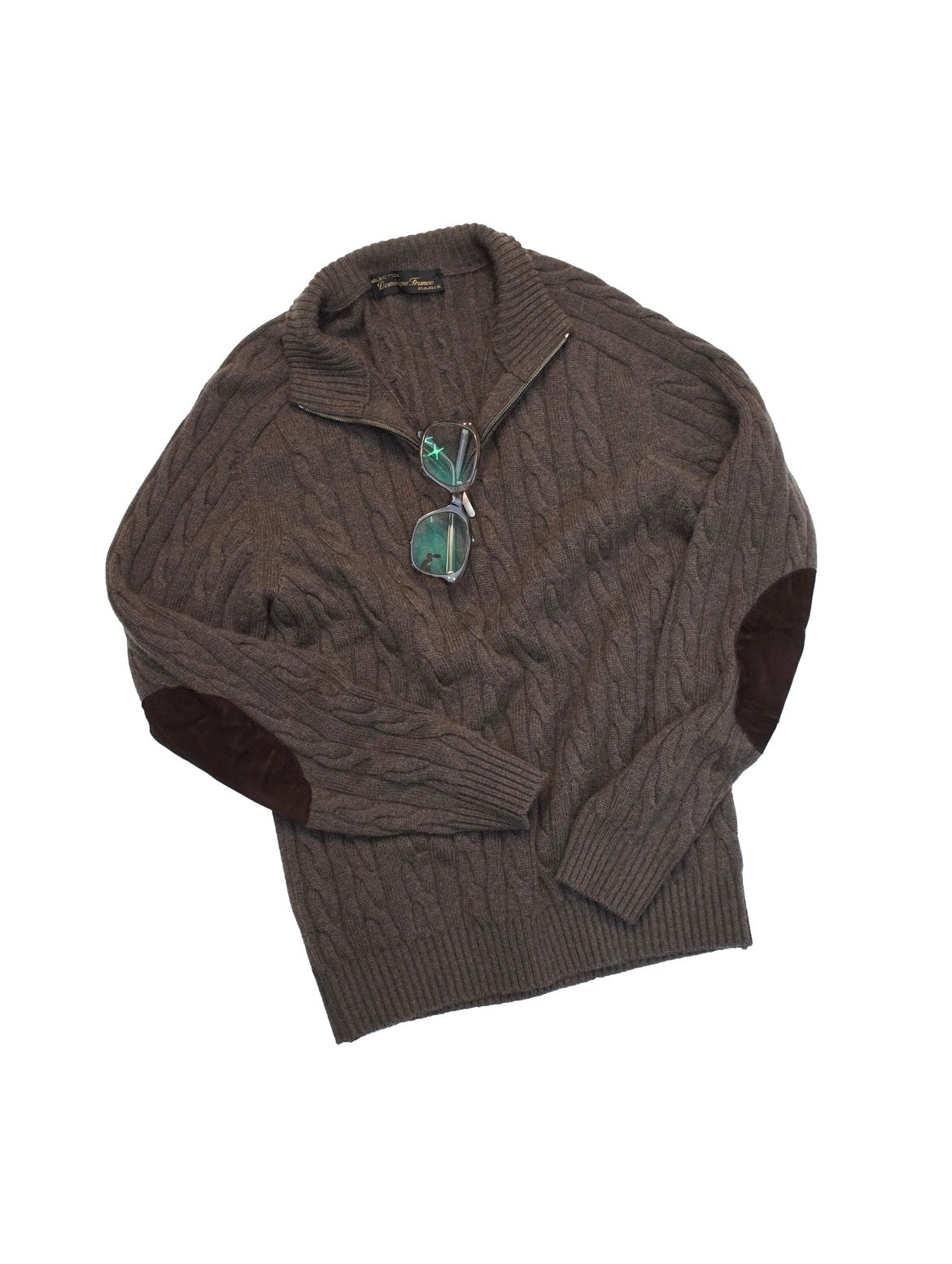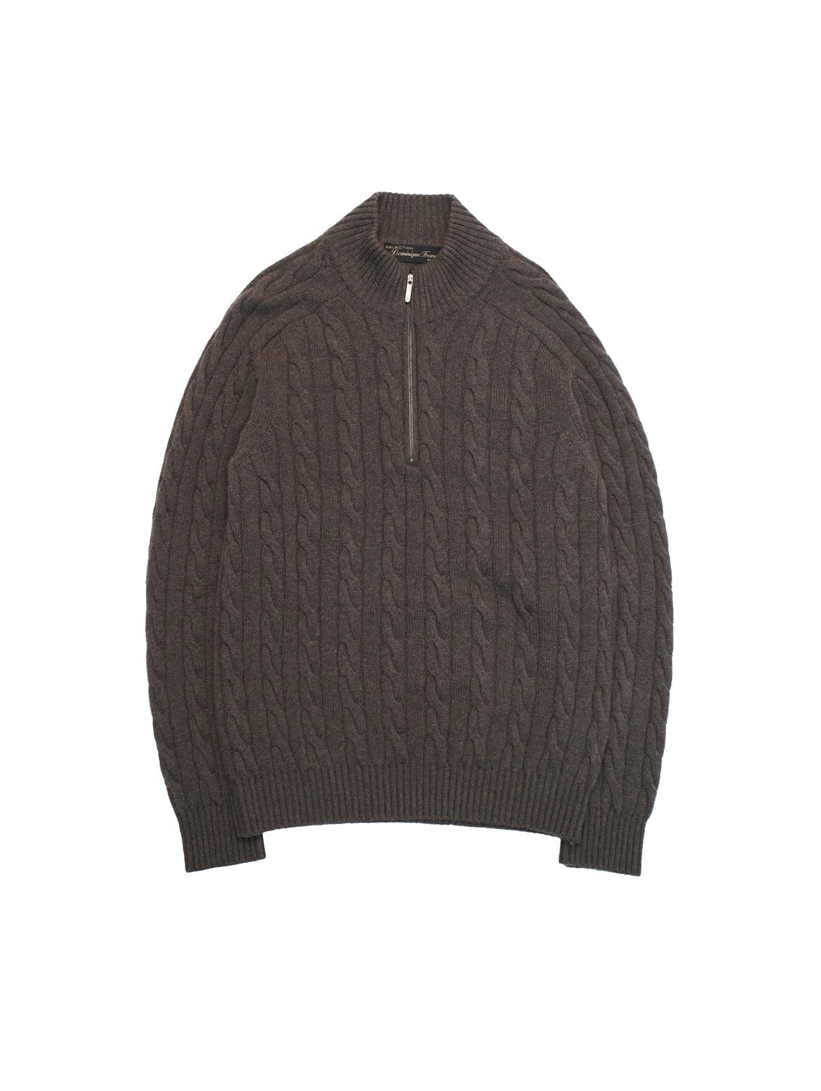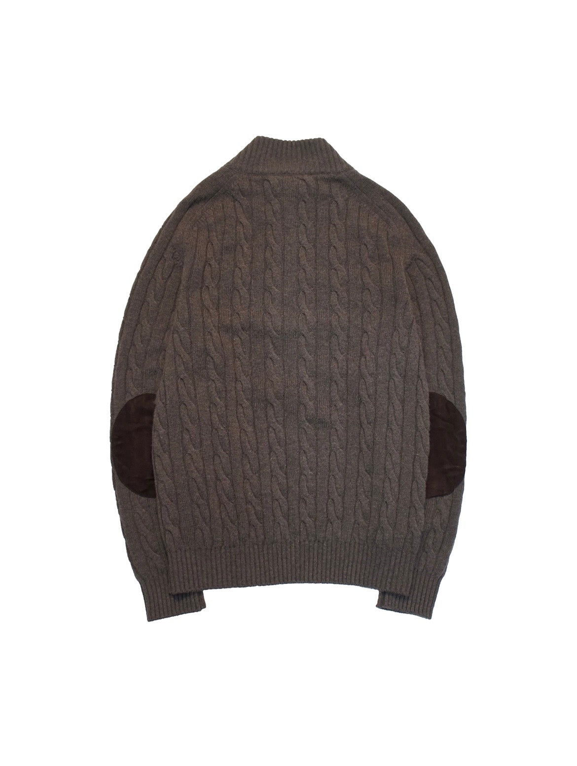 ハイネックにハーフジップ、エルボーパッチ、ケーブル柄と欲張りなデザインながら、 グレージュのボディにブラウンのパッチと統一感のある色味で上品な印象。
