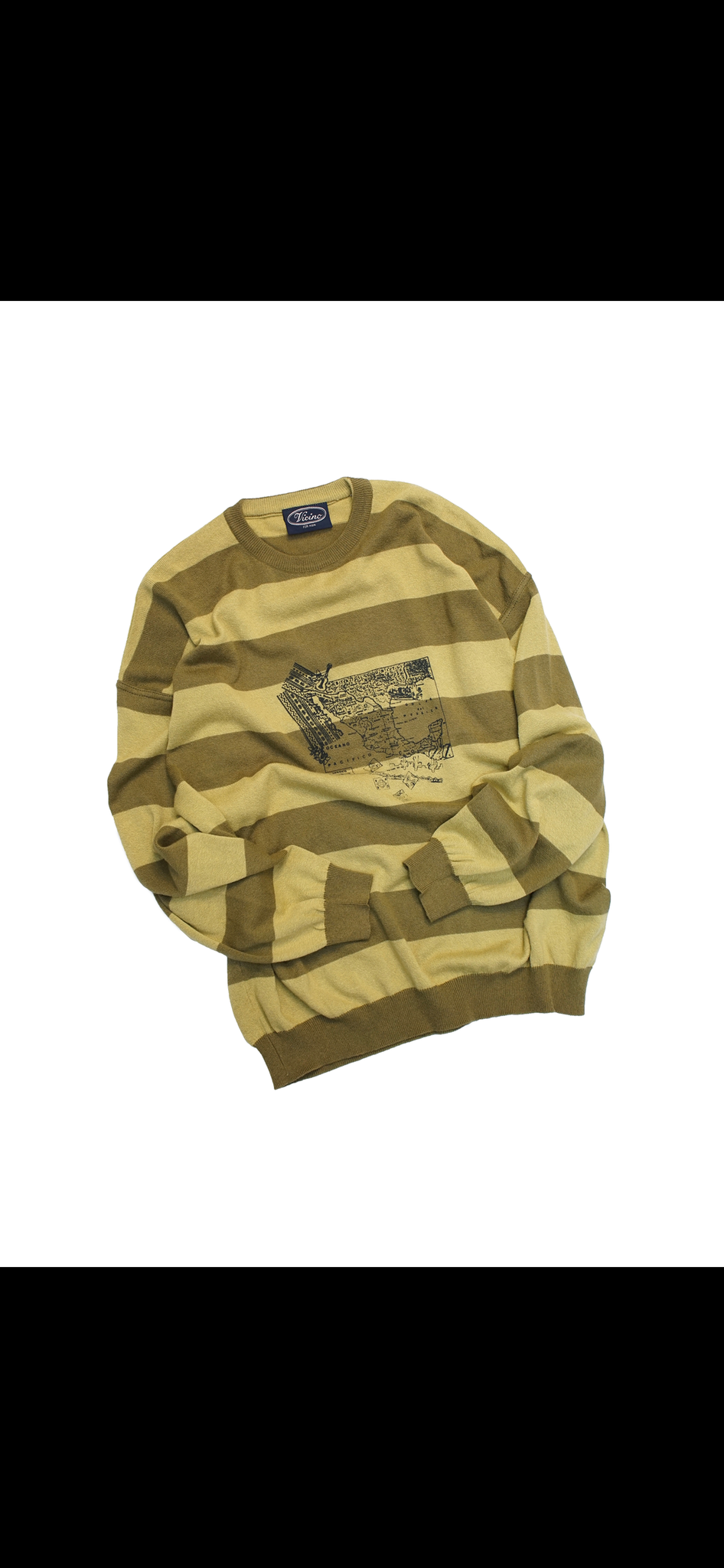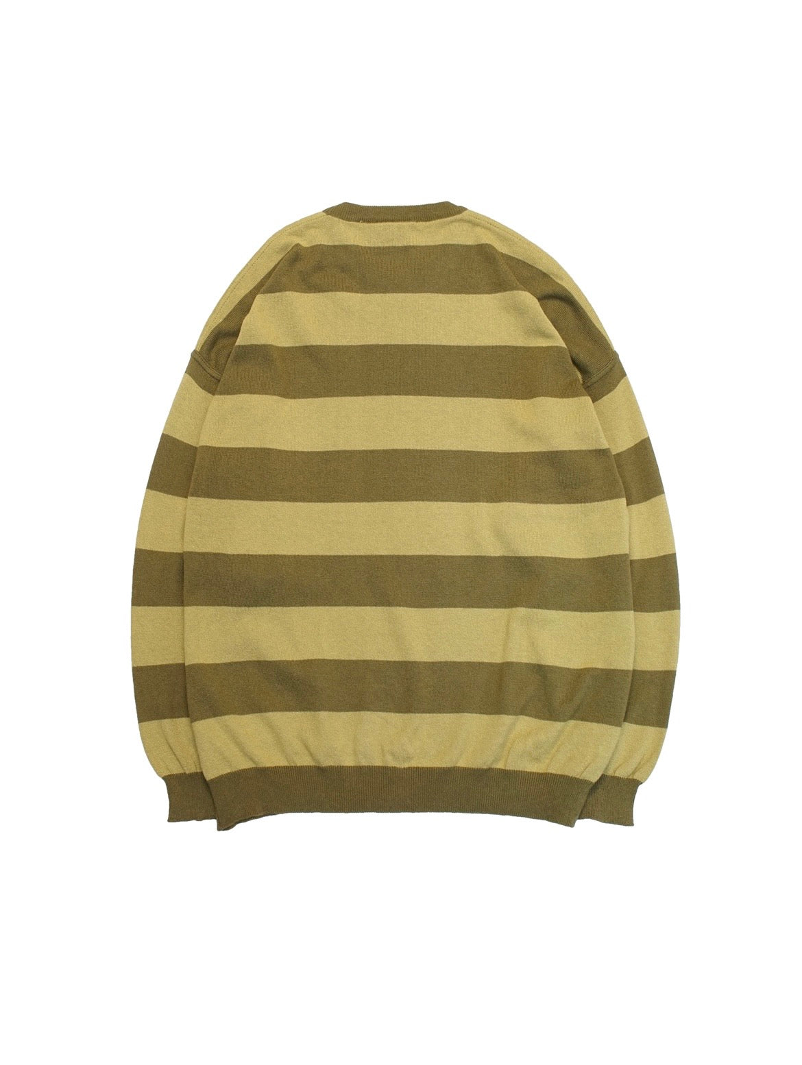 パンキッシュな雰囲気になるワイドなボーダーパターンながら、カーキとうぐいす色の配色やフロントのプリントでいい具合にハズしが効いています。