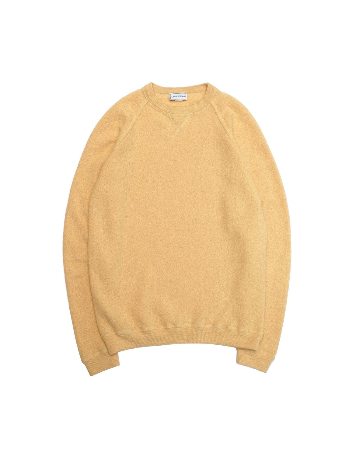 薄いイエローの色味、ベビーアルパカ100%のふわっと軽い質感に粒々とした網目のパールニッティングは柔和な印象。